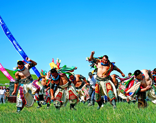 蒙古式摔跤(現(xiàn)統(tǒng)稱“博克”),不受年齡、體重和地區(qū)限制,不計時間,采取一次淘汰制。賽前,由一位德高望重的長者進行編排和配對,現(xiàn)在則由大會組委會作出安排。參賽博克(摔跤手)必須是偶數(shù),根據(jù)蘇木(鎮(zhèn))、旗(縣)不同層次級別,參賽博克為32、64、128、256對不等。參賽博克上身穿鑲有銅釘或銀釘,用牛皮或多層帆布制成的“昭德格”(摔跤服),腰間扎上寬厚的皮帶,系上用紅、蘭、黃三色綢子制成的圍裙,下身著白色肥大的摔跤褲和繡有吉祥圖案的套褲。足蹬蒙古靴。項戴五色綢穗制成的彩帶“景嘎”.景嘎越多.表示參賽博克獲獎的次數(shù)越多。